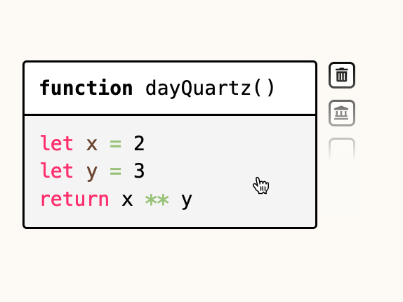 A function's return value is not communicated either. I don't really know where to display it. Should it pop up below the function in question? And then fade out after some time? Should return values all be accumulated in a sidebar? I want something that will feel natural to users; maybe it's time to get some users!